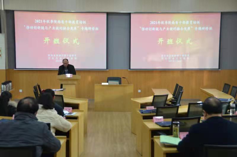 12月1日上午,由省委组织部主办、我校干训基地承办的2021年秋季陕西省干部教育培训“推动创新链与产业链的融合发展”专题研修班在我校明德校区培训中心顺利开班,来自省直机关单位、县(市、区)政府的50余名领导干部参加了开班仪式,继续教育学院副院长吴民生出席开班仪式并致欢迎辞。