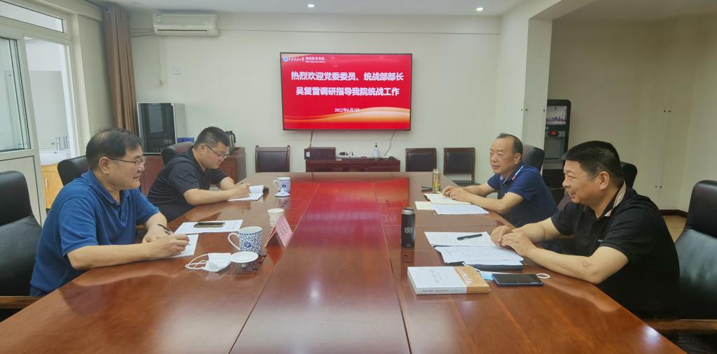 6月7日上午,校党委委员、党委统战部部长吴复雷一行2人来我院调研指导统一战线工作。党总支书记耿岭,党总支统战委员、院长谈建勤参加会议。