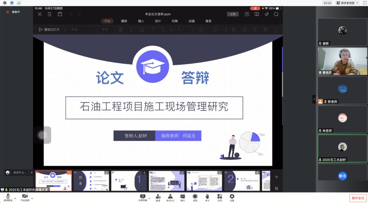 为确保“云答辩”工作顺利进行,学院不断优化线上视频答辩流程,制定了周密的答辩工作方案,线上答辩与线下答辩同要求,严格程序,严肃纪律,保障线上答辩圆满完成。答辩进行时,每位学生按照规范流程进行个人身份证件展示、PPT汇报、回答问题等环节。评委教师以严格的标准进行论文评审、听取答辩、提出问题,在指出论文的亮点和不足的同时,对学生的论文提出进一步意见与建议。线上答辩结束后,同学们根据老师建议积极修改论文,以顺利完成答辩。