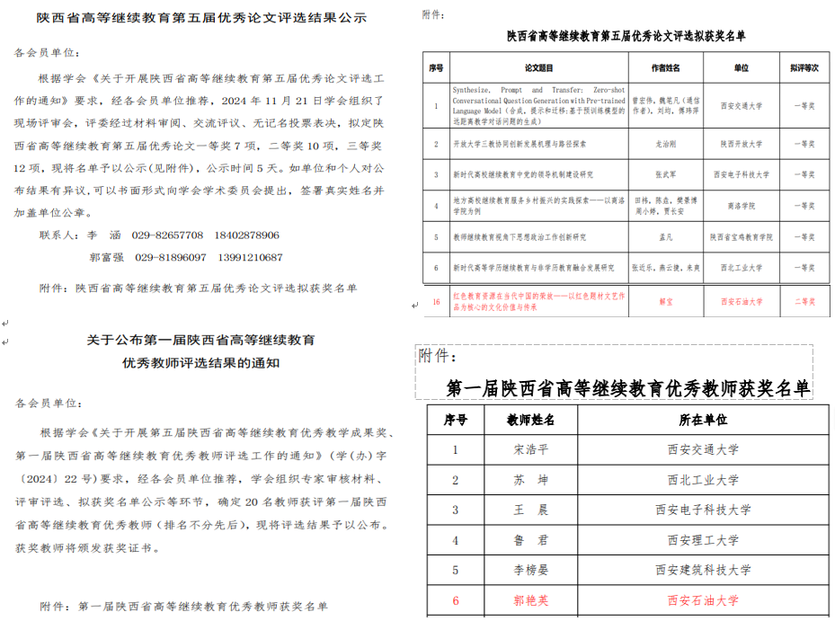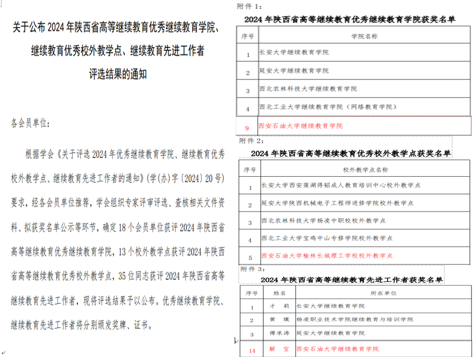 近日,在陕西省教育厅指导下、陕西省高等继续教育学会组织实施的两年一次的各类评比评选中,我校继续教育工作获得多项荣誉表彰。在“2024年陕西省高等继续教育优秀继续教育学院、继续教育优秀校外教学站点、继续教育先进工作者”评选中,我校继续教育学院(培训中心)荣获“陕西省高等继续教育优秀继续教育学院”,我校榆林长城理工学校校外教学点获得“陕西省继续教育优秀校外教学站点”,继续教育学院(培训中心)解宝荣获“陕西省高等继续教育先进工作者”称号;在“陕西省高等继续教育第五届优秀论文”评选中,继续教育学院(培训中心)解宝获得优秀论文二等奖;在“陕西省第一届高等继续教育优秀教师”评选中,马克思主义学院郭艳英荣获“陕西省高等继续教育优秀教师”称号。