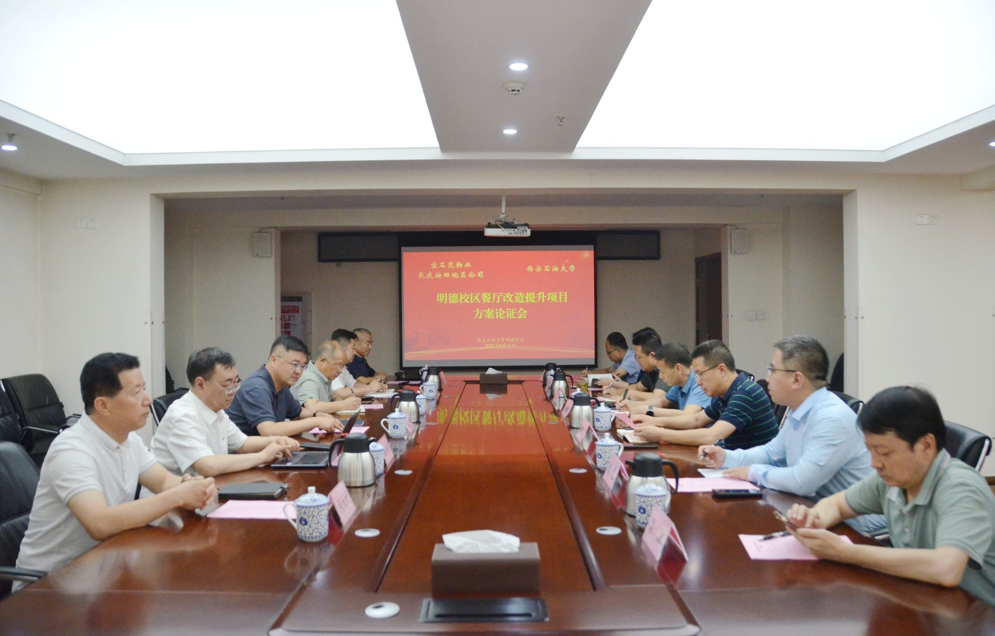 6月11日下午,学校与宝石花物业长庆油田地区公司在明德校区召开“明德校区餐厅改造提升项目”方案论证会,双方围绕项目设计方案进行深入研讨,进一步优化功能布局。宝石花物业长庆油田地区公司市场部总监王恒、运营部工程管理主任李建宁等6人,我校研究生工作部、后勤处、国际教育学院及继续教育学院负责人参加会议?;嵋橛杉绦逃г海ㄅ嘌抵行模┰撼ぃㄖ魅危┝趾煜戎鞒?。
