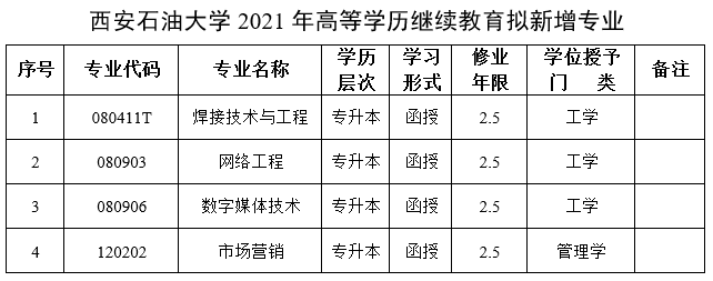 我校2021年高等继续教育新增专业审议工作已经结束。现将结果予以公示。本次公示时间为2021年1月8—14日。公示期内如有异议,请以书面形式反馈继续教育学院。