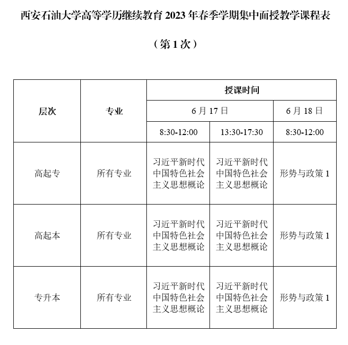 为进一步落实《教育部关于推进新时代普通高等学校学历继续教育改革的实施意见》和《陕西省推进新时代普通高等学校学历继续教育改革实施方案》相关要求,积极推进我校高等学历继续教育面授教学工作,提高教育教学质量。现结合我校实际,将2023年春季学期面授教学相关事项通知如下。