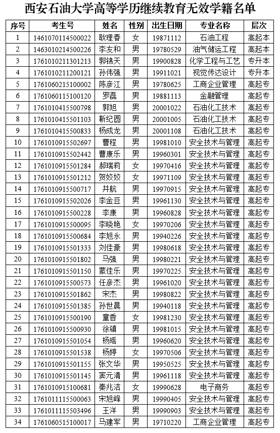 附件:西安石油大学高等学历继续教育无效学籍名单