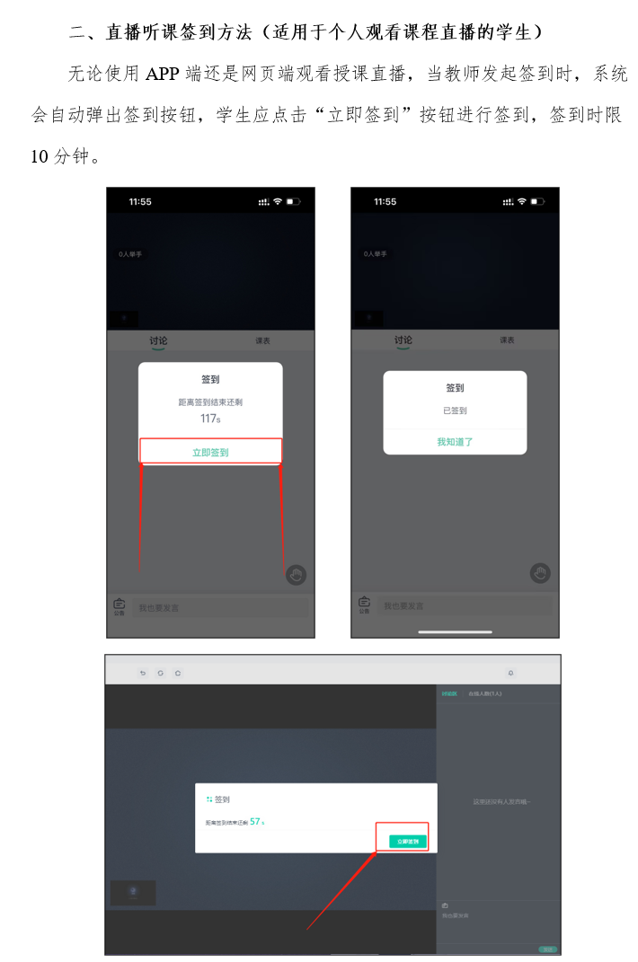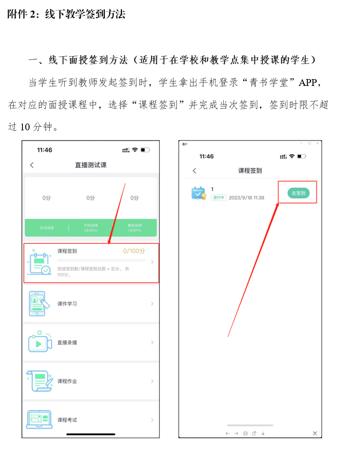 线下面授期间,学生应根据教师提示及时在青书学堂APP进行签到,签到方法见附件2,签到情况将纳入平时成绩。因特殊原因不能按时参加线下教学的学生,应向所在教学点书面请假(请假条须有单位公章),按时观看课程直播并完成线上签到(仅观看课程回放不得分)。