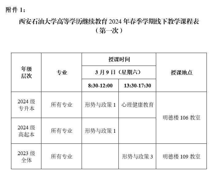 为进一步落实《教育部关于推进新时代普通高等学校学历继续教育改革的实施意见》和《陕西省推进新时代普通高等学校学历继续教育改革实施方案》相关要求,积极推进我校高等学历继续教育线下教学工作,提高教育教学质量。现结合我校实际,将2024年春季学期线下教学相关事项通知如下。