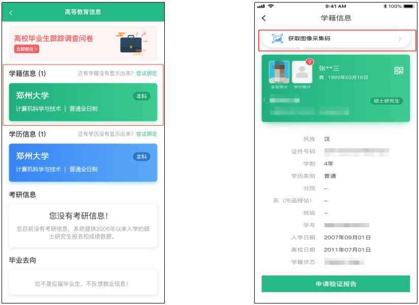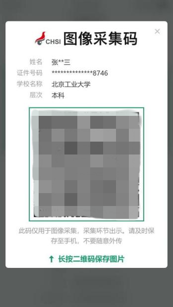 2.学信网启用基于图像采集码的加密采集传输模式。学信网为每个学生提供专属加密的二维码(简称采集码),采集码中包含学生唯一编号,姓名、证件号码等毕业生图像采集所需的必要信息,其中姓名和证件号码进行脱敏处理。