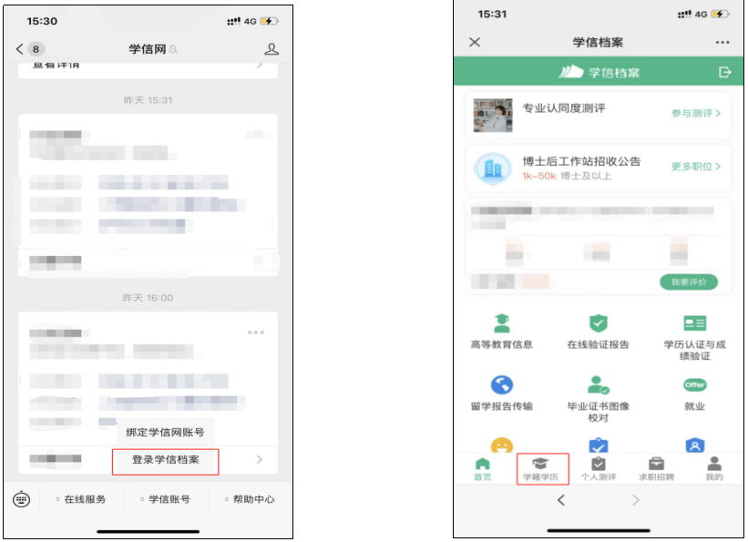 关注“学信网”公众号,绑定学信网账号,点击“学信账号”,查看学籍学历信息。